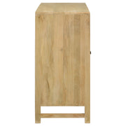 Infuse your space with the organic beauty of this global-inspired accent cabinet, crafted from eco-friendly mango wood in a warm natural finish. The three cabinet doors feature woven cane panels, adding a retro touch while allowing for subtle ventilation. Antique brass-finished knobs offer a refined contrast, enhancing the cabinet’s timeless appeal. The spacious interior with shelving provides ample storage for dining essentials, entryway organization, or living room decor. With clean lines, rounded edges, and a light wood tone, this cabinet blends modern simplicity with earthy charm.