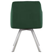 This contemporary style dining chair features a retro-inspired design with a bucket style seat. The supportive, foam-filled cushioned seat is wrapped entirely in a soft green velvet upholstery, complete with a vertical channel tufted back and interior. The seat itself rests upon four sharply angled legs in a polished chrome finish that adds an edge to its style. In addition, the base offers a 360-degree swivel mechanism that allows guests to effortlessly come and go as they dine and converse. Slide this dining chair up to a pub table or game table in a media room too.