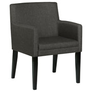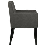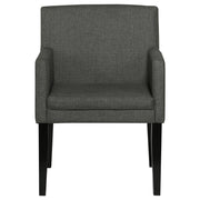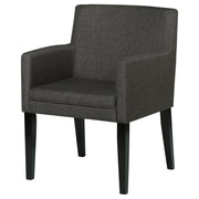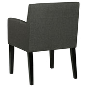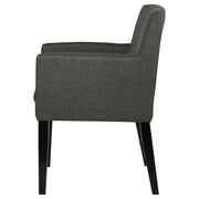 Enhance your casual dining room with these stylish mid-century-inspired dining chairs. Featuring cushioned arms wrapped in durable charcoal grey fabric, they offer both comfort and style. The sleek design and versatile color effortlessly complement any dining space, creating a cozy and inviting atmosphere. Elevate your dining experience with these chic and comfortable chairs.