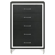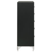 Inspired vintage touches create a refined sensibility for a modern five-drawer chest. Its tall, compact profile is ideal for a dressing area, offering plenty of storage with five roomy drawers that host everything from clothing and accessories to linens and other personal effects. The chest shows off a bold black finish, complete with gleaming chrome trim that adds coolness and elegance. Its long bar drawer pulls add character, while hair pin inspired legs bring retro glamour and sophistication. Add decor to the top for a personal touch in your bedroom.