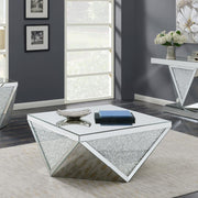 • 40-inch square mirrored coffee table with bold, diamond-shaped base
