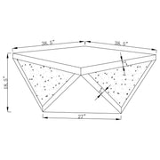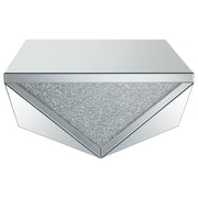 Amplify the style of your living room with this mirrored coffee table. Its bold, diamond-shaped base features triangular mirrored panels with alternating glittery material, adding shimmering sparkle and opulent style. A 40-inch square, reflective surface tops off the design with a touch of glam, making it an exquisite centerpiece for any contemporary home. This coffee table brings a luxurious and artistic flair to modern living spaces.