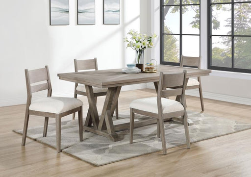 CoasterTrestle inspired style brings charming character to a five-piece modern farmhouse dining room set. It focuses on a rectangular dining table, comple...