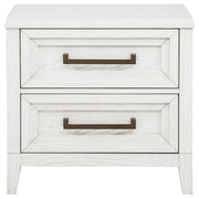 Bring fresh perspective to your bedside with a modern two-drawer nightstand. Its casual style and classic stance create a restrained look and feel, perfect for a soothing bedroom space. It features a distressed white finish over wood grain, creating subtle depth and detail. Drawers are roomy for bedside essentials, and stepped fronts add character and dimensionality. Contrasting antique brass toned bar pull complete the look, offering stylish allure in your stylish bedroom.