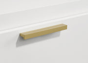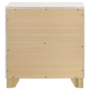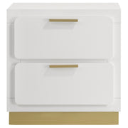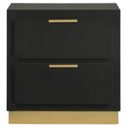 Put the finishing touches on a chic bedroom with a modern two-drawer nightstand. In black with metallic gold embellishments, it's the perfect solution for nighttime storage. Drawer fronts feature rounded corners for a softened look and feel. Use the top for a reading lamp or personal decor that brings inviting ambiance. Drawers hold up to 44 pounds each, perfect for everything from personal items to books and other accessories.