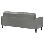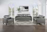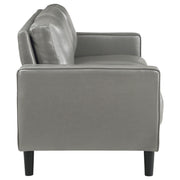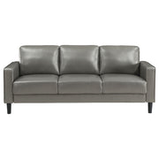 Establish the foundation of a stylish living room with a modern sofa. Smooth faux leather creates a sleek, neutral look that brims with sophistication. Track arms create a structured silhouette, offering tailored flair with an understated ambiance. Straight, tapered legs support the sofa and ensure stability. Supportive cushions create an inviting look and feel, with sinuous spring decking under seat cushions and webbing across the back for optimal comfort.