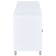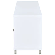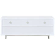 Ideal for a living room with contemporary decor, this TV console exudes updated style. The dazzling shine of chrome combines with a crisp, clean white finish for a pleasingly modern look. Its chic silhouette is complete with an elegant brushed silver frame, adding a pleasing touch of polish. Endlessly versatile, it features three open storage compartments and two large lower drawers to easily keep your space organized. For added depth and a more subdued look, this console is also available in deep, rich cappuccino.