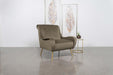 With a stylishly curvy silhouette, this accent chair offers an artisan approach to furnishings in your custom casual or semi-formal space. Embellish a living room or family room with a chic chair creating palette versatility and a romantic ambiance. Relax in style and beauty with a delicious design in seating, starting with plywood framing and soft textured velvet upholstery. Alluring flared silhouetting on its full-length armrests adds comfort in conjunction with an extra-wide build, as a comfy attached seat invites hours of pleasing leisure. Bring in a hint of retro style with slender, splayed gold metal legs and button caps that create a whimsical satellite effect.