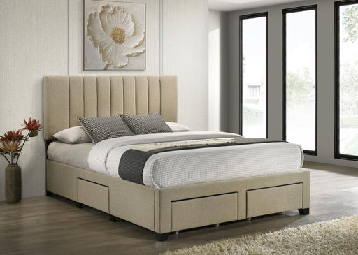 CoasterClean lines and quiet storage come together in this upholstered platform bed, where form meets thoughtful function. The vertical channeled headboar...