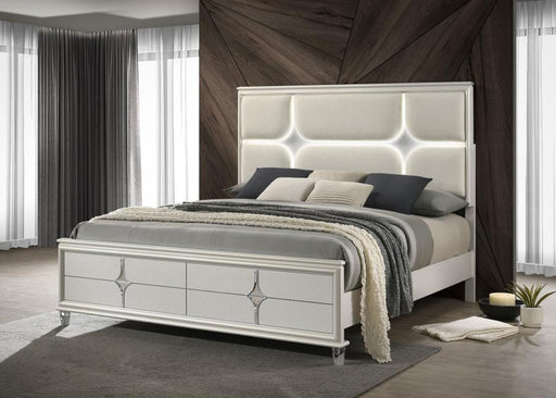 CoasterThis modern bed showcases a high-gloss white frame paired with a bold LED-lit headboard for striking impact. The panel headboard features a white f...