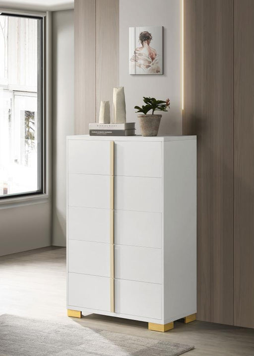 CoasterMaximize bedroom storage with this modern 5-drawer chest, designed with clean lines and a streamlined silhouette. A bright white high gloss finish ...