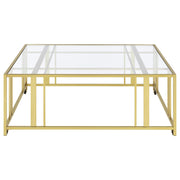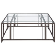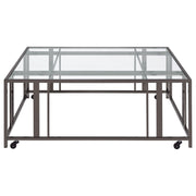 This square coffee table combines functionality with modern style, featuring a tempered glass top and a sturdy geometric base made from heavy-gauge metal. The open-frame design creates a sleek, contemporary look, while smooth-rolling casters add mobility for easy repositioning. Its scratch-resistant materials ensure durability and low maintenance, making it a versatile centerpiece for any living room or shared space.