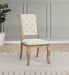 Graceful and inviting, this upholstered dining chair pairs timeless design with modern comfort. The gently curved legs and tufted backrest create a refined silhouette, while bronze nail head trim adds a subtle touch of sophistication. Its cream-toned upholstery offers a soft, neutral contrast to the barley brown wood frame. Crafted from solid rubberwood and foam cushioning, this elegant side chair combines durability and plush comfort, perfect for both formal dining occasions and daily family meals.