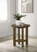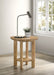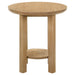 • Washed oak finish brings soft tone and subtle wood grain to the circular surface and shelf